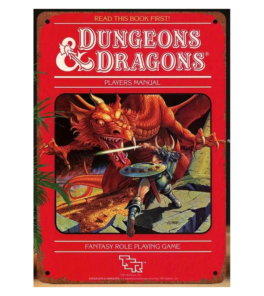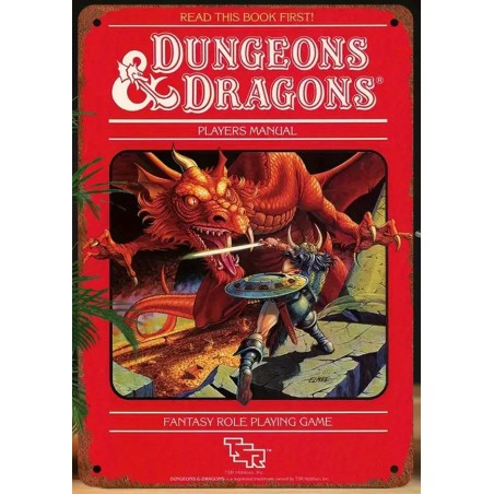 Cartel metálico con diseño clásico de la mítica caja de Dungeons & Dragons.