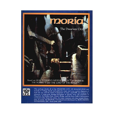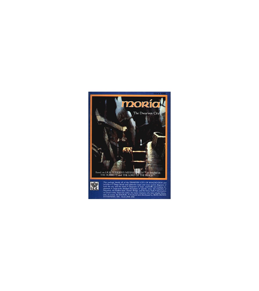 This package details all of the DWARVEN CITY OF KHAZAD-DUM and includes 7 Deeps (levels and sublevels) maps and cross-section diagrams of both the city and the mines, diagrams of traps, machines and forging implements, large-scale detailed floorplans of specific areas: the Chamber of Marzarbul, the Endless Stair, Durin’s Bridge, and the Entry Halls, information on Durin’s tribe, three Orc tribes, the many creatures who later inhabit Moria, and, of course, the BALROG.