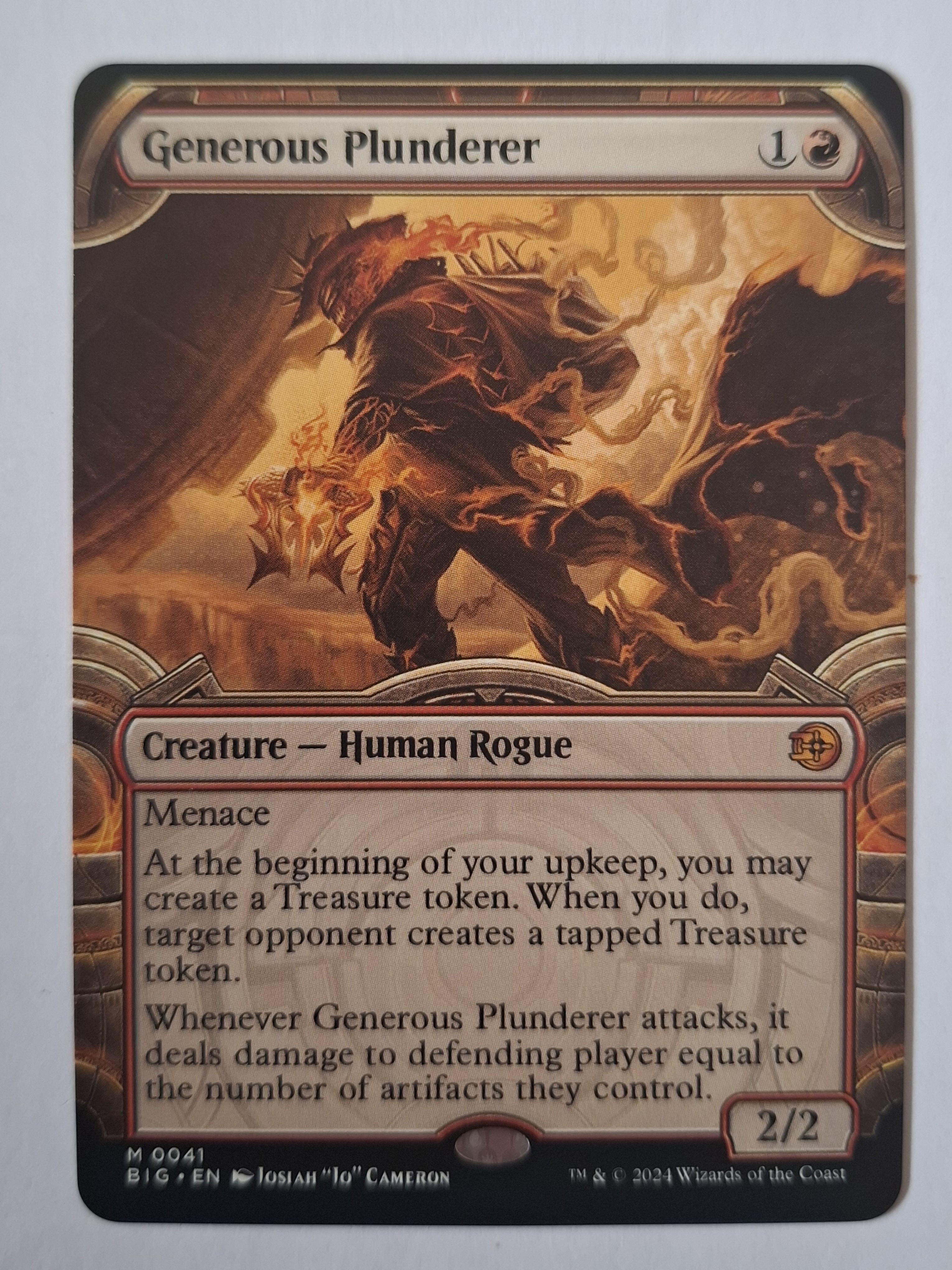 Menace At the beginning of your upkeep, you may create a Treasure token. When you do, target opponent creates a tapped Treasure token. Whenever Generous Plunderer attacks, it deals damage to defending player equal to the number of artifacts they control.